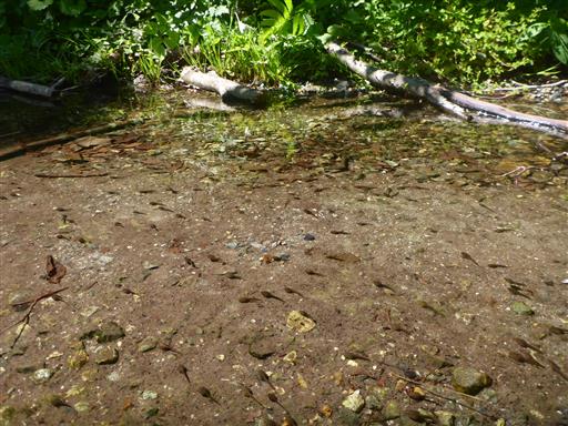 道路にある大きな水たまりに大量のオタマジャクシが住んでいる。