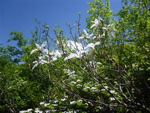 タムシバとオオカメノキ。どちらも白い花をつけている。