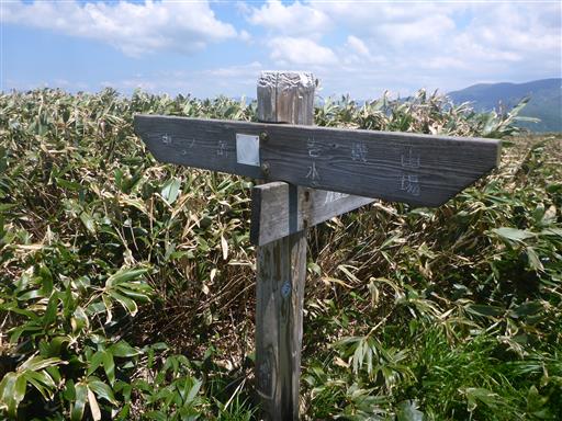 左:中ノ岳、右:巻機山の標識。まるで巻機山まで登山道が通じているかのような書き方だ。