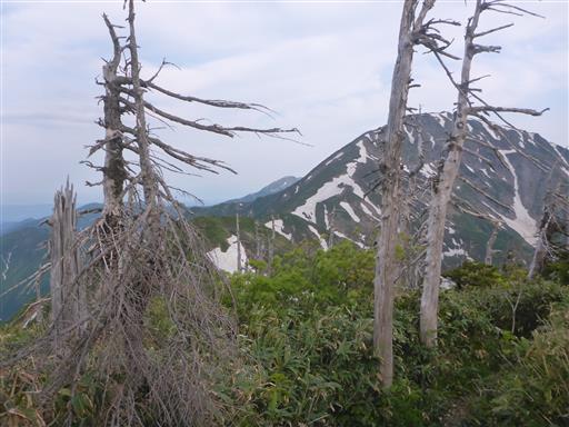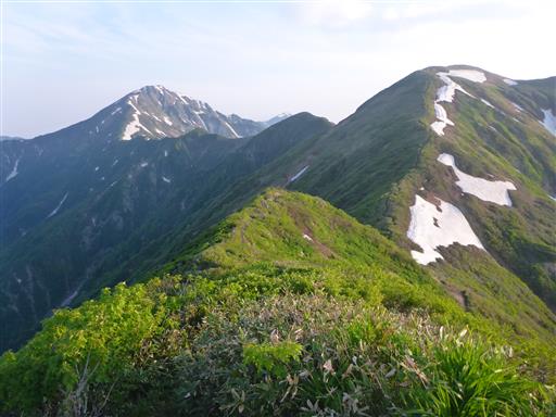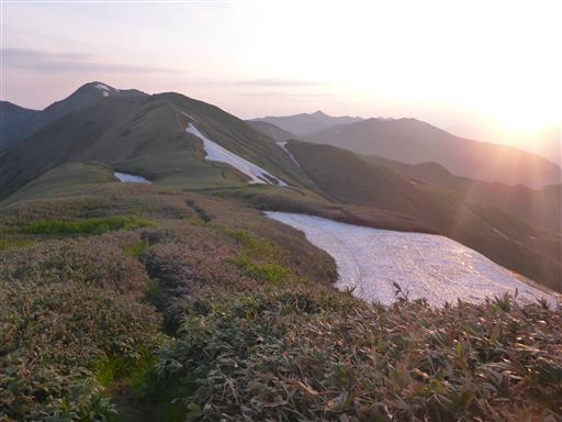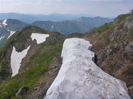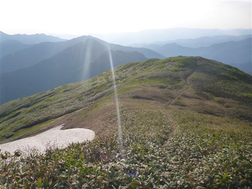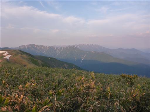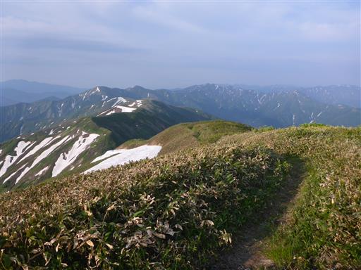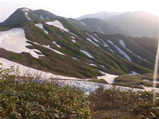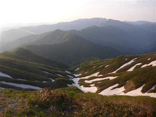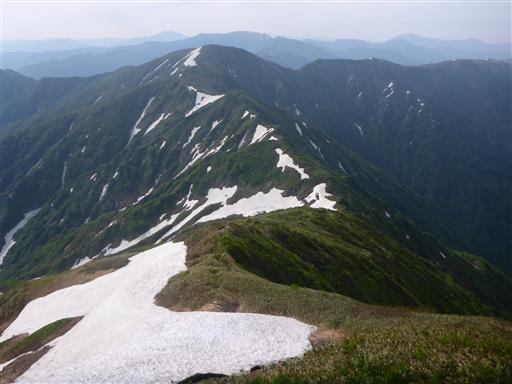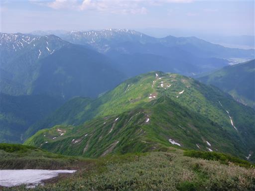 歩いてきた稜線を見渡す。真ん中が兎岳、右端が本日の出発地点の丹後山だ。