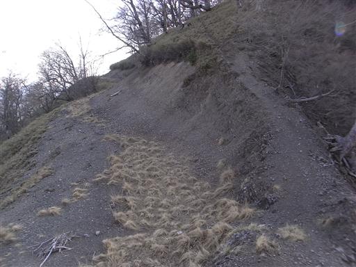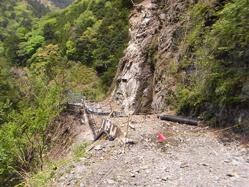 しばらく歩くと林道崩壊箇所に到着する。見事に崖が崩壊している。