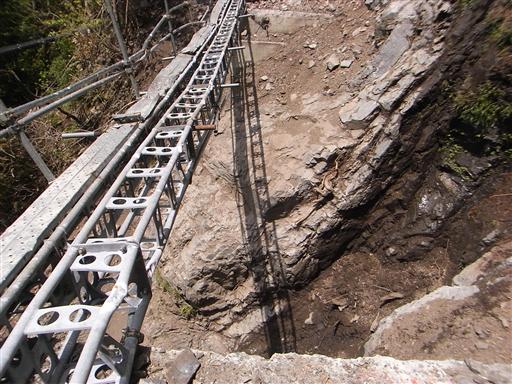 工事用にかけられた簡易の橋は、落石によって足場も手すりもボロボロ。今にも崩れ落ちそうだ。