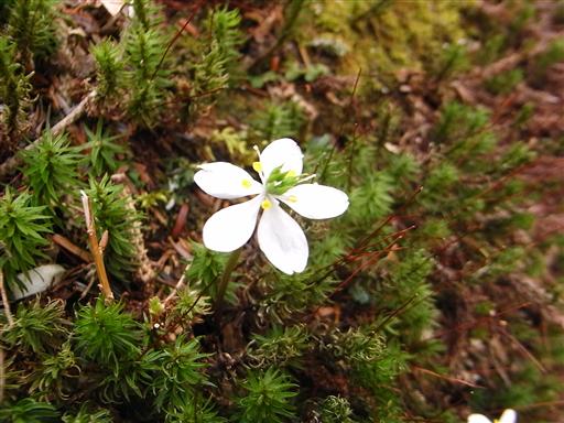苔生した原生林の中にミツバオウレンの花が咲いている。