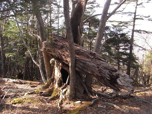 巨大な倒木が木の間に挟まっている。何か凄まじい光景だ。