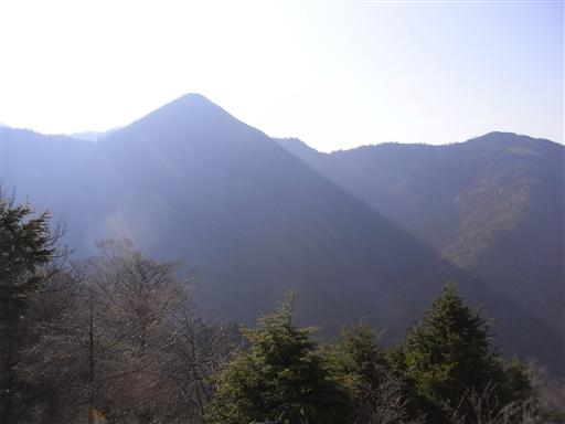 北側を望むと逆光の中に、明日行く予定の黒法師岳が浮かんでいた。
