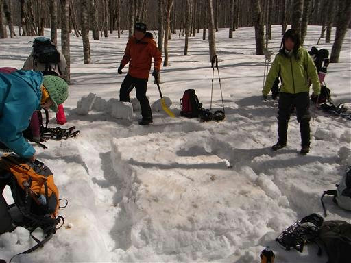 スコップで穴を掘って簡易テーブルを作り、昼食をとる。