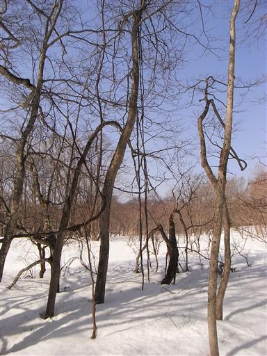 あちらこちらに山葡萄の蔓が縦に伸びている。