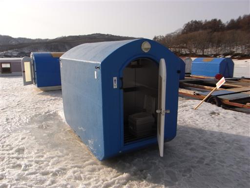 外で釣りをすると非常に寒いので、簡易のボックスがあちこちにある。
