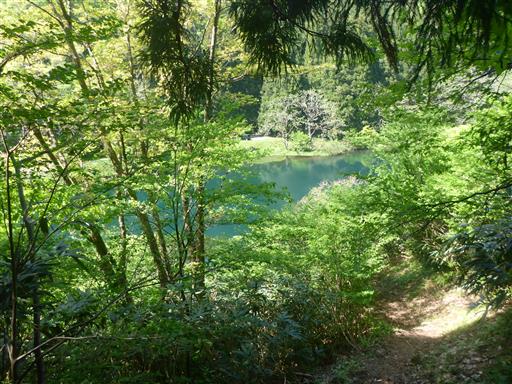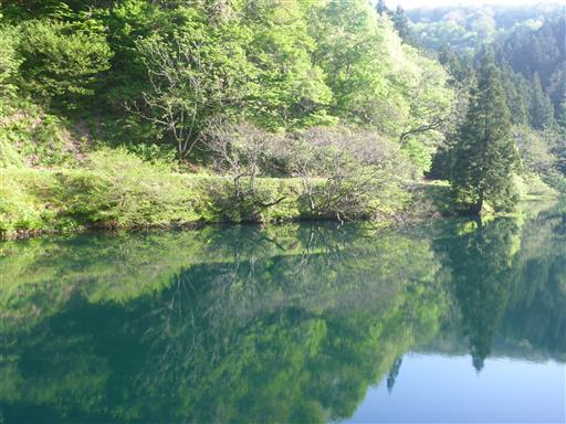 反対側の湖面はさざ波一つなく、新緑の景色を映している。