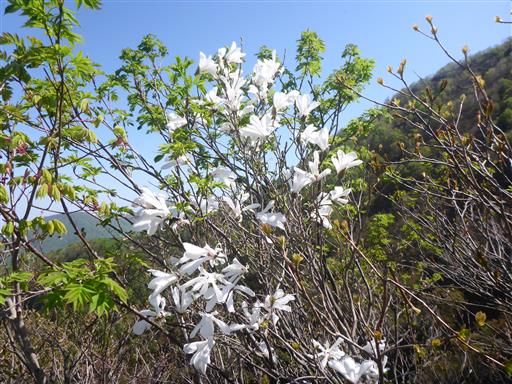 標高を上げるとあちらこちらでタムシバの花が見られるようになる。