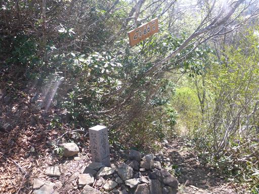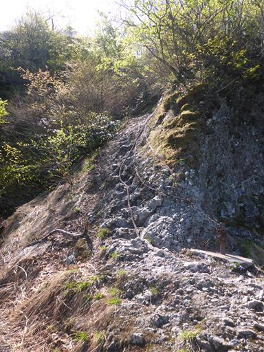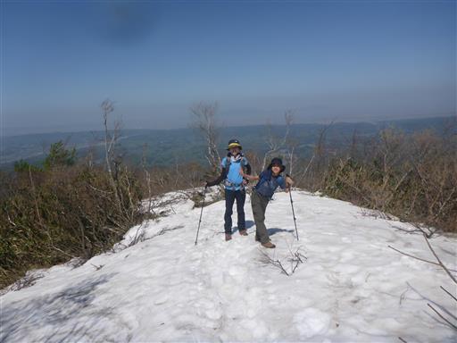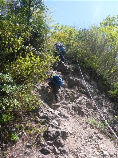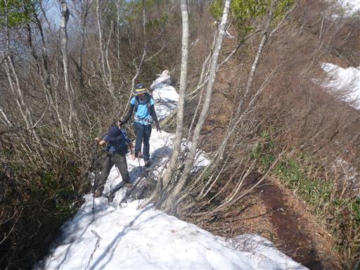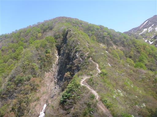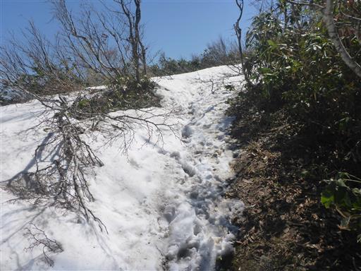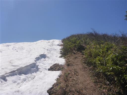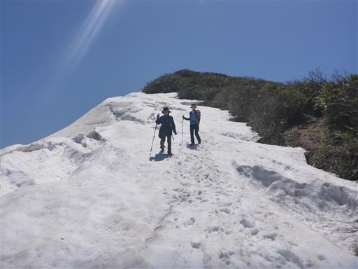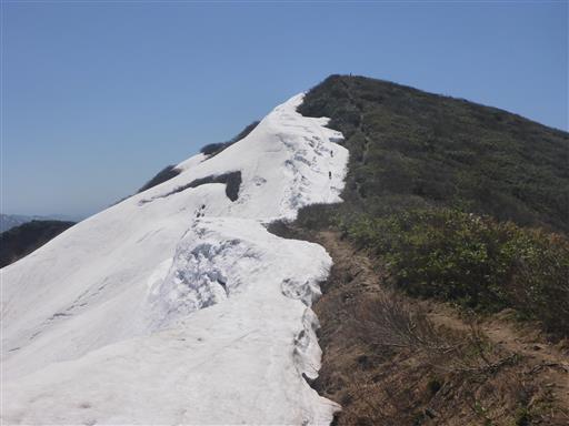 登山道は雪に覆われていないが、左側の残雪の上を歩いている人が見える。