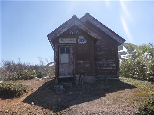 粟ヶ岳ヒュッテに到着。小さな避難小屋だ。