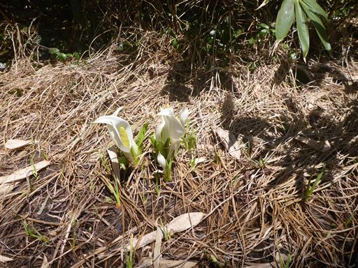 小さな水たまりに水芭蕉の花が咲いている。登りでは気が付かなかった。