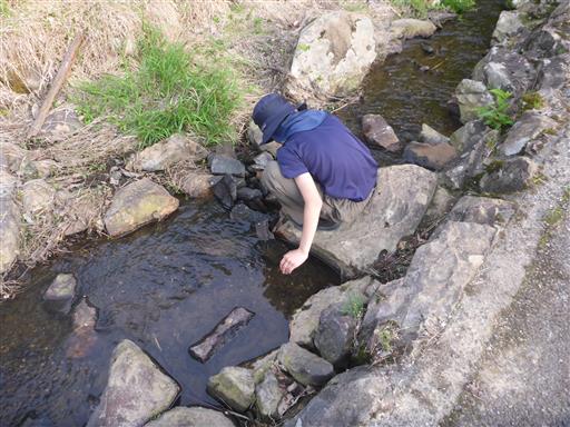 息子はキャンプ場内を流れる小川を石で水をせき止めて遊んでいる。