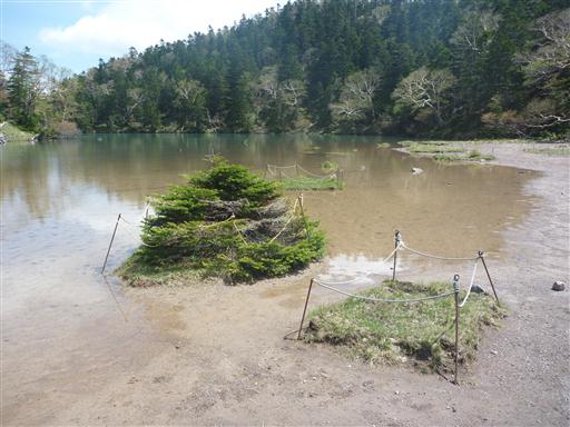 弥陀ヶ池の畔で一休み。岸辺にわずかに残った陸地になぜかロープが張られている。