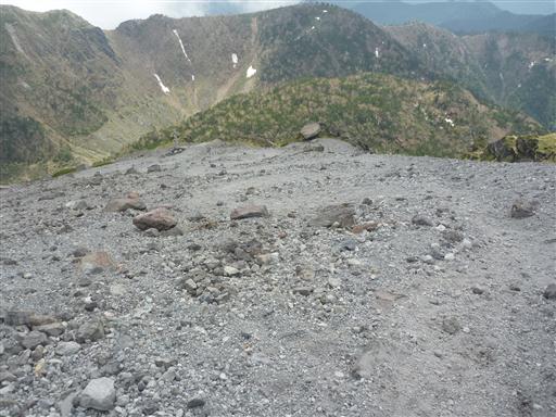 この辺りは砂礫地だ。滑りやすい斜面をジグザグに下って行く。