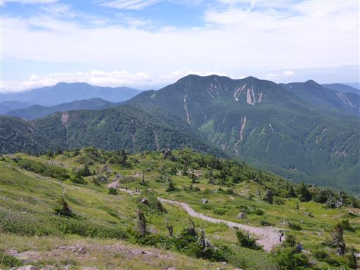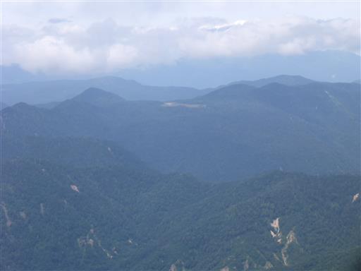 歩いてきた道を振り返る。多くの山々が折り重なっている。