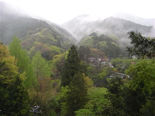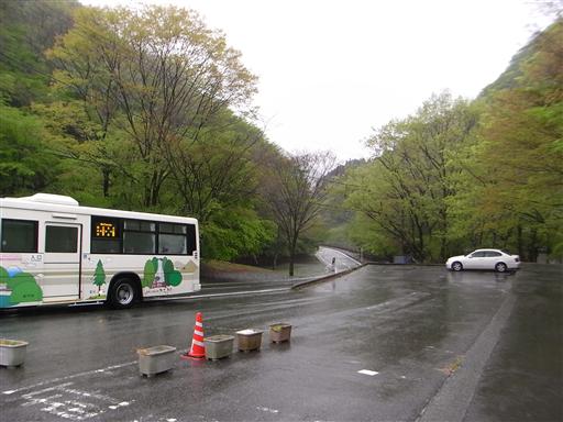 雨の中、中川バス停に到着する。周囲は雲に包まれている。