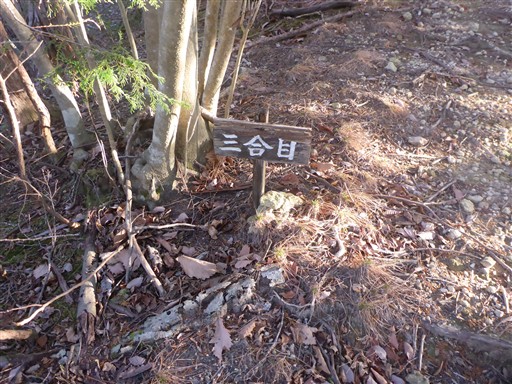 分かりにくい標識だが、ここで左折して尾根から外れる。