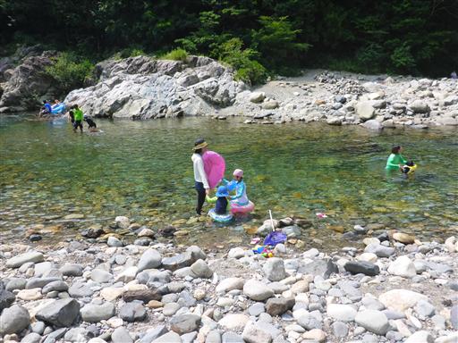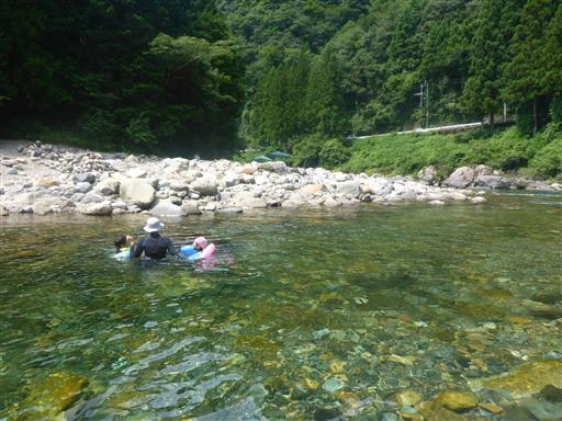 子供達に浮き輪を付けて早速川に入る。水は冷たい。