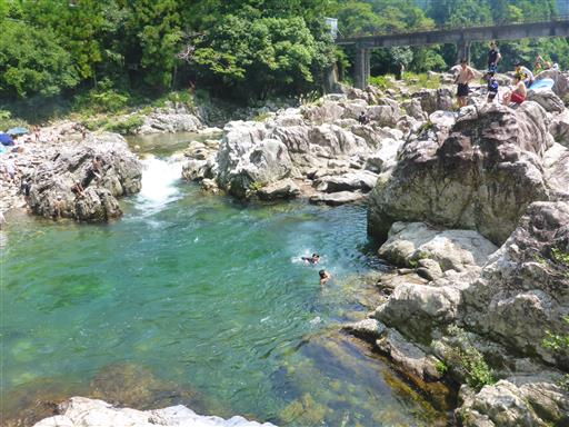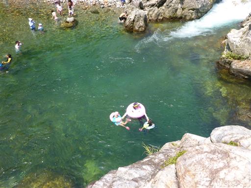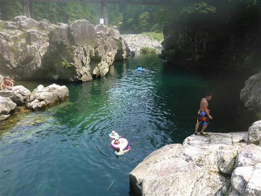 岩の上から次々と人が川に飛び込んでいる。