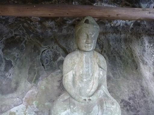 基部のオーバーハングした部分に石像が置かれている。