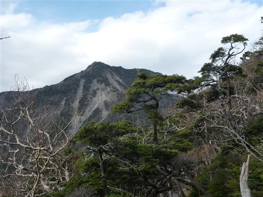 樹林の中から女峰山の山頂部が見えてきた。