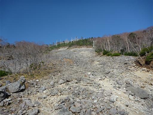 ガレ場を見上げる。上空は再び青空が広がってきている。