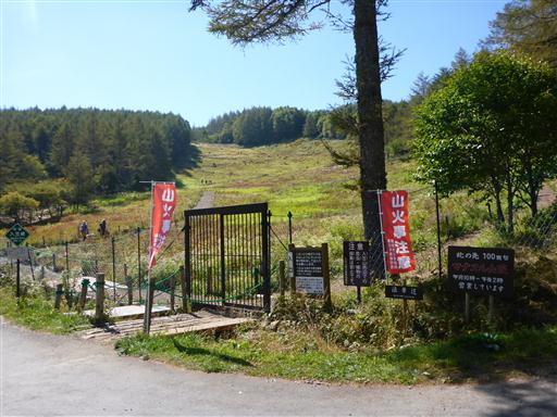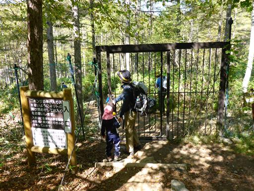 入笠湿原の入口に到着。動物除けの大きな扉を開けて中に入る。