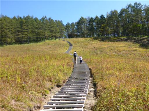 湿原に伸びる木道を歩く。少し奥の方の道に入ると人通りは少なくなる。
