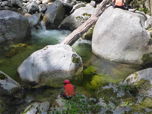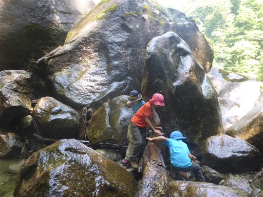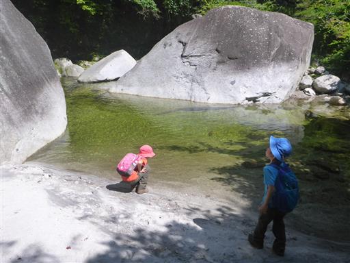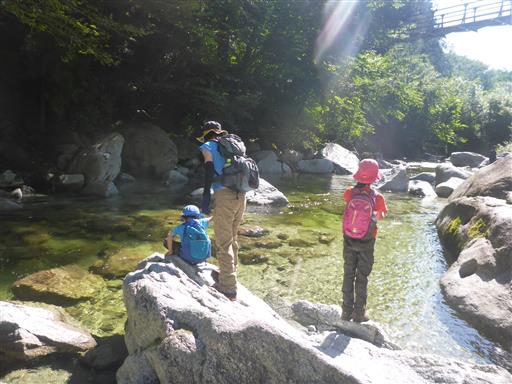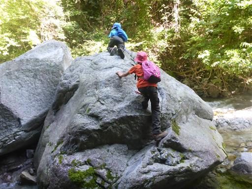 子供達は岩の上を歩き回ったり、川に触れたりして遊んでいる。