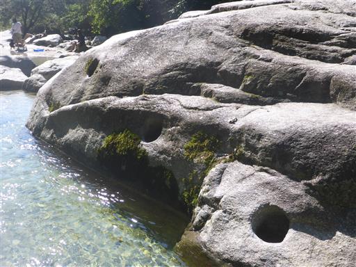 岩に穴が3個開いている。ポットホールかと思ったが、人工的な穴のようだ。