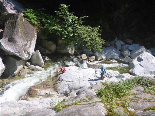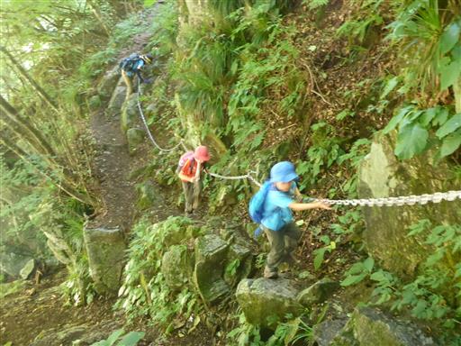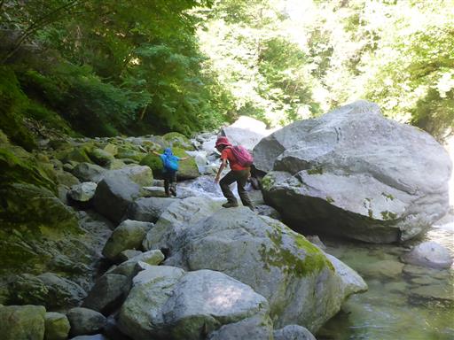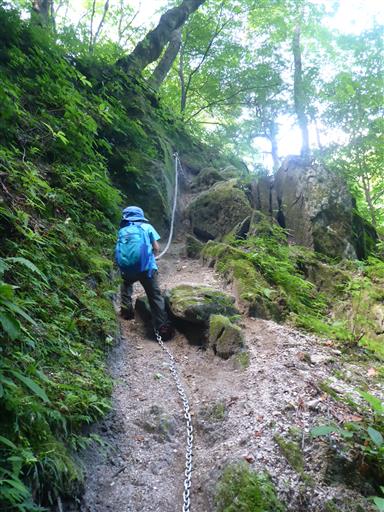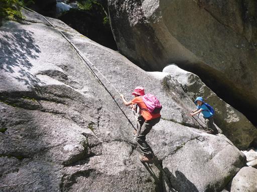 不動滝直下は大きな岩があり、ロープに捕まって登る。