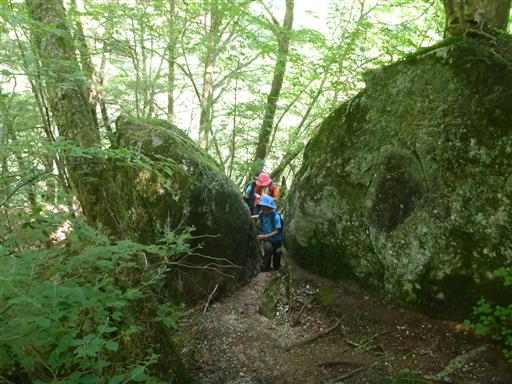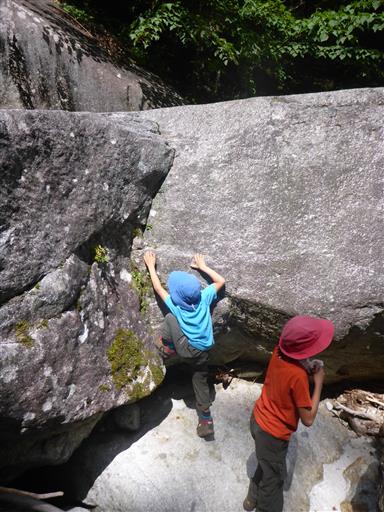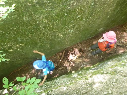 子供達は岩の割れ目の下に降りて遊んでいる。
