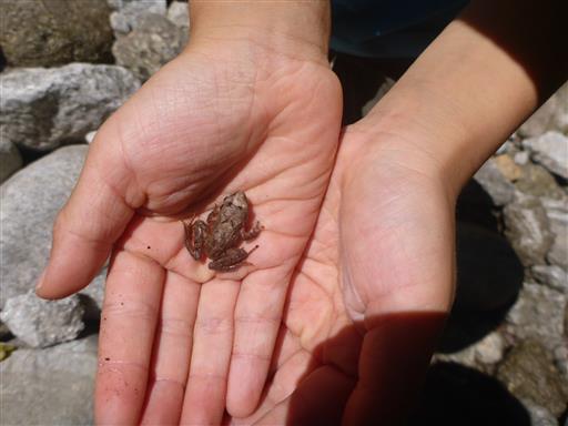 息子がカエルを捕まえる。まだ小さなカエルだ。