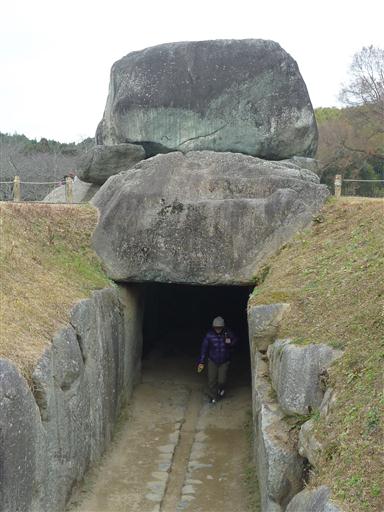 石舞台古墳。巨大な石が積み上げられている。