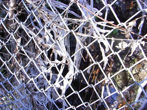 つらら。茎を伝って水が流れていて、それが凍り付いている。