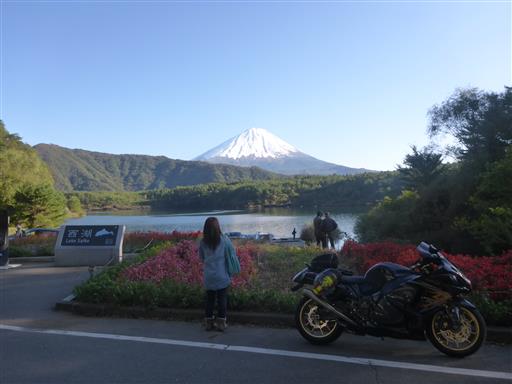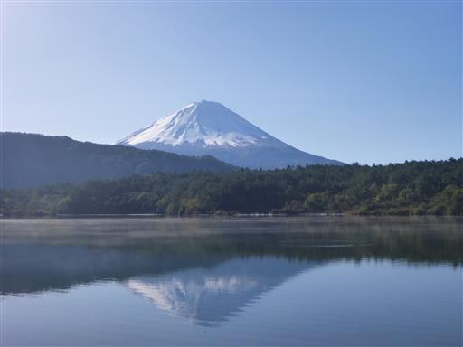 本日は見事な快晴。西湖に逆さ富士が映っている。