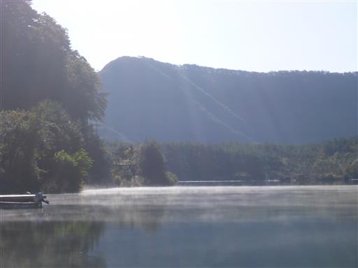 湖から朝霧が発生している。幻想的な風景だ。