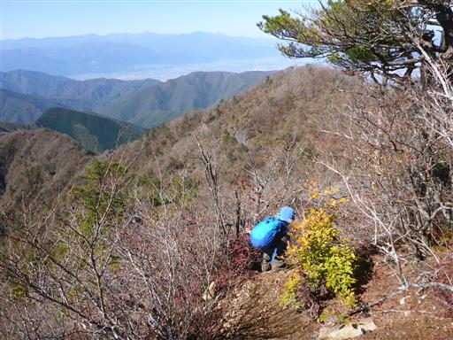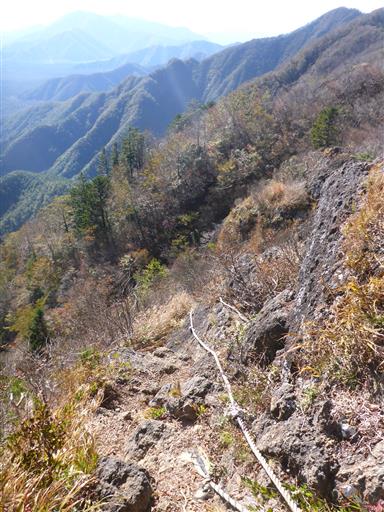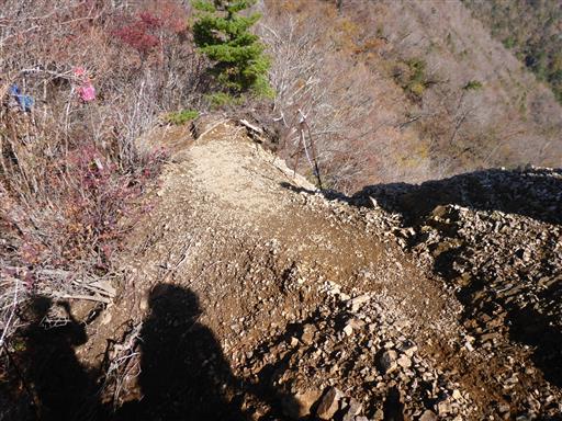 痩せ尾根を越える。両側が切れ落ちたザレ場。