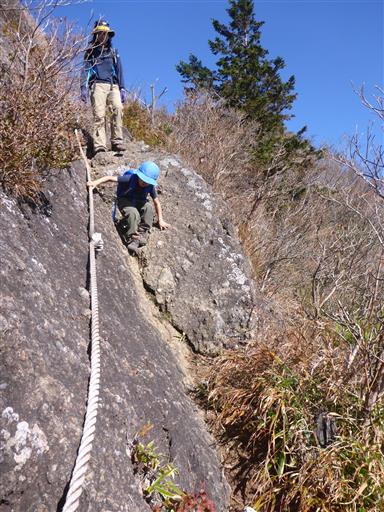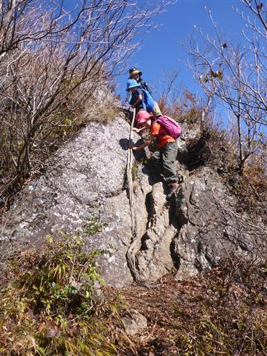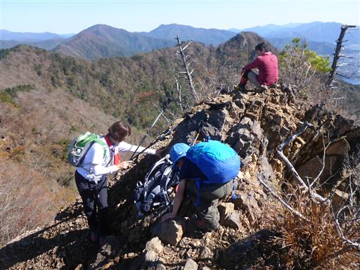 岩場を登る。この稜線はアップダウンが続くかなりの痩せ尾根だ。