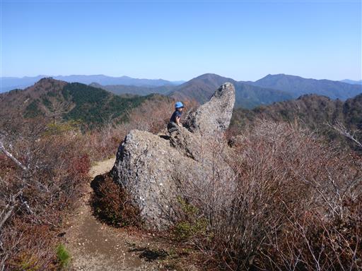 息子は即座に山頂の真ん中にある大岩に登っている。