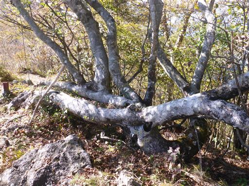 複雑な形の木。横になっている木は生きているようで、倒木という訳ではなさそうだ。