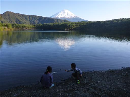 子供達は富士山には目もくれず、地面で何か遊んでいる。