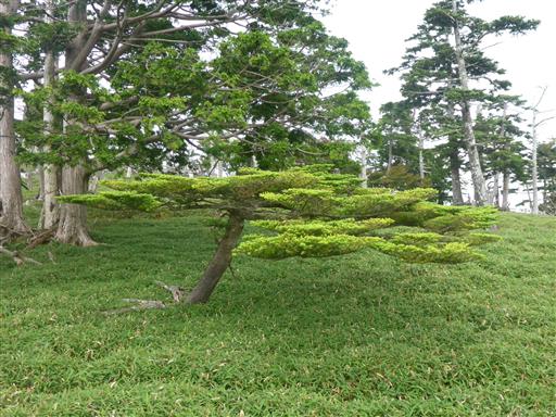 上が平たい変な形の木が立っている。
