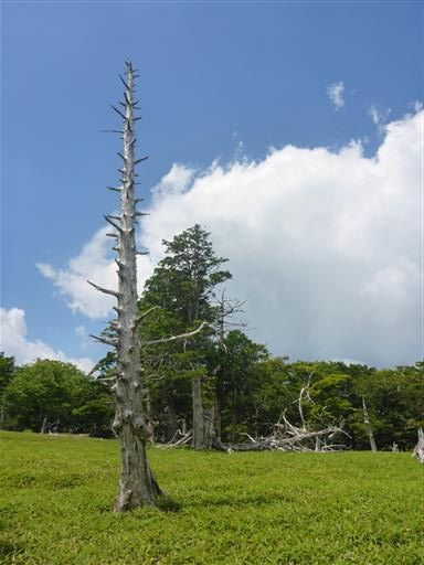 笹原に目立つ枯れ木が一本立っている。