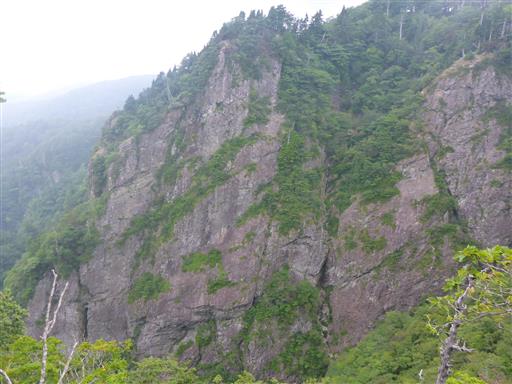 大台ヶ原の名所、大蛇嵓に向かう。すぐ側に巨大な岩壁が見える。