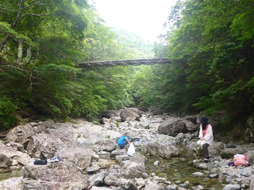 シオカラ谷の吊橋に到着。吊橋の下で再び休憩する。