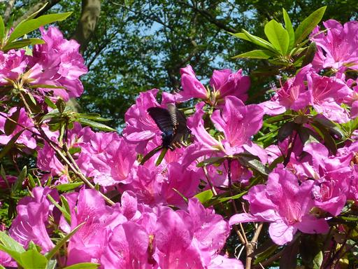 満開のツツジの花。たくさんのアゲハチョウが飛んでいる。
