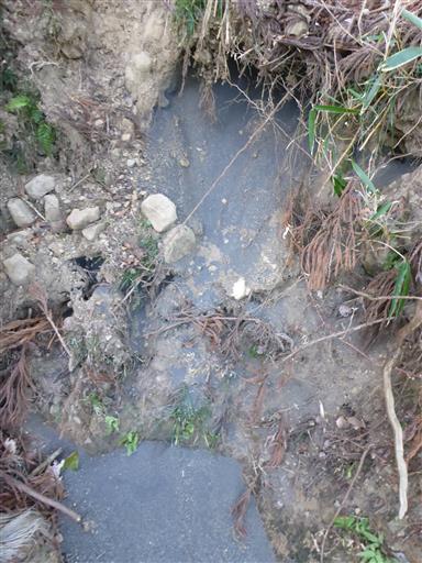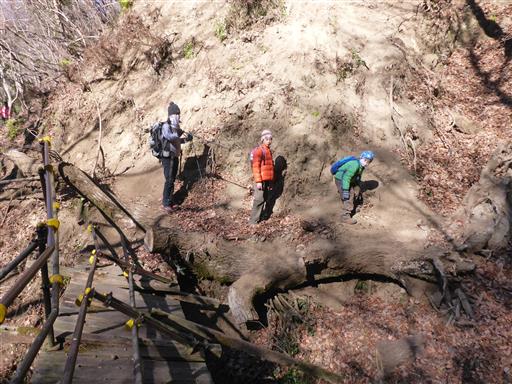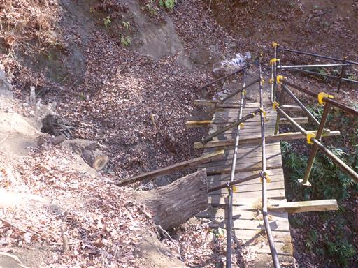 崩落地点。木橋は壊れていて通行不能で、左側から回り込む。